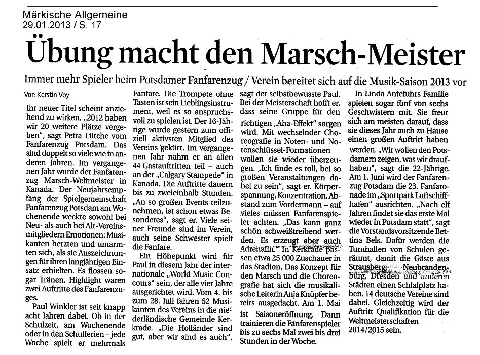 Ein Artikel der "Märkische Allgemeine" über die SG Fanfarenzug Potsdam e.V. und über die Fanfaronade 2013 vom 29.01.2013 >hier lesen<